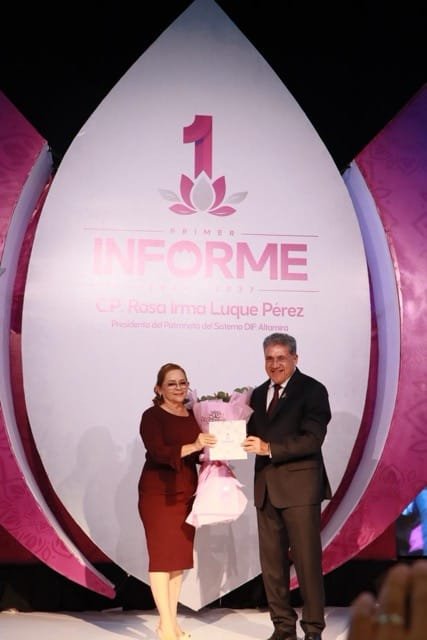 En un emotivo acto realizado en el Tecnológico de Monterrey, Campus Altamira, la presidenta del Sistema DIF municipal, C.P. Rosa Irma Luque Pérez, rindió su Primer Informe de Actividades 2024–2027, acompañada del alcalde Dr. Armando Martínez Manríquez, autoridades y representantes de la sociedad civil.
