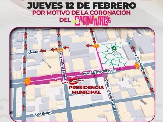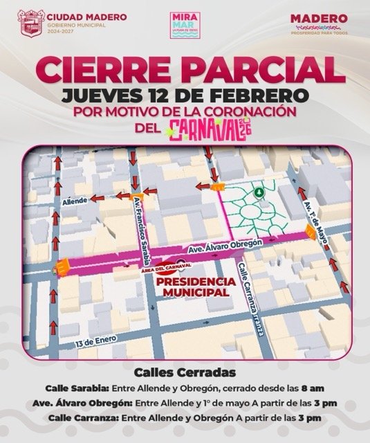Ciudad Madero, Tamaulipas.— Con motivo de la Coronación del Carnaval Conurbado 2026, este jueves 12 de febrero se realizará un cierre parcial de calles en la zona centro de Ciudad Madero, informó el presidente municipal, C.P. Erasmo González Robledo.