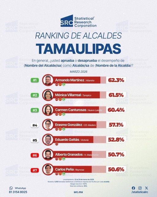 Según el Ranking de Alcaldes de Tamaulipas, elaborado por la firma Statistical Research Corporation, el edil altamirense se posiciona en el primer lugar en aprobación ciudadana, alcanzando un 62.3 por ciento. La medición se basa en la opinión de los habitantes respecto al desempeño de sus autoridades municipales.