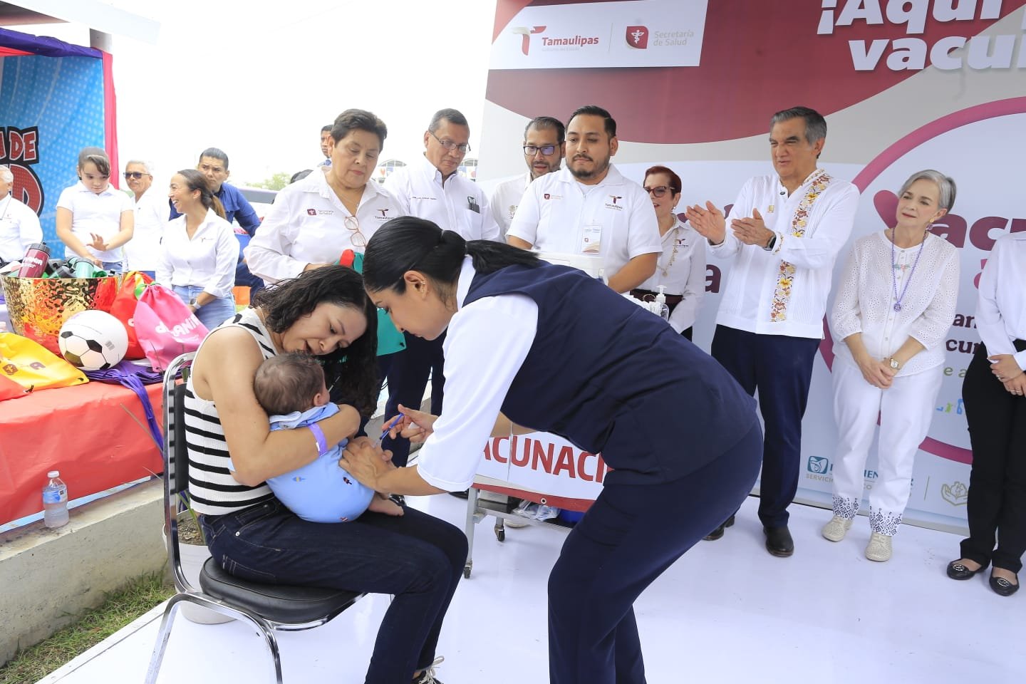 En el marco de la magna celebración DIFZania, en el recinto ferial de esta capital, junto con la doctora María de Villarreal, presidenta del DIF Tamaulipas, el gobernador aplicó las primeras dosis de la vacuna hexavalente y de la vacuna contra el sarampión a cuatro menores de edad.