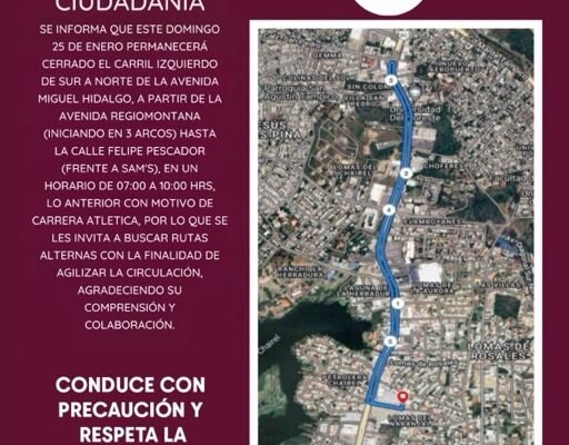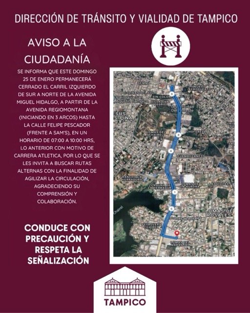 El Gobierno Municipal de Tampico, a través de la Dirección de Tránsito y Vialidad, informa a la ciudadanÃa que, este domingo 25 de Enero permanecerá cerrado el carril izquierdo de sur a norte de la Av. Miguel Hidalgo, a partir de la Av. Regiomontana (3 Arcos) hasta la Calle Felipe Pescador (frente a SAM´S) en un horario de 07:00 a 10:00 horas, con motivo de Carrera Atlética.