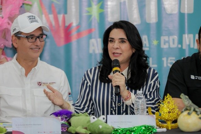 Mónica Villarreal Anaya, alcaldesa de Tampico, acompañada del secretario de turismo en el Estado, Benjamín Hernández Rodríguez y los presidentes municipales de Ciudad Madero y Altamira, Erasmo González Robledo y Armando Martínez Manríquez respectivamente, encabezó la sesión informativa para dar a conocer los pormenores del carnaval conurbado 2026, que se efectuará del 12 al 15 de febrero en los municipios sur tamaulipecos.