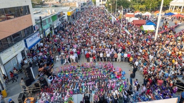 Uno de los momentos más emblemáticos de la celebración fue la partida de la mega rosca de 483 metros lineales, la cual superó récords y fue reconocida como la más grande del estado de Tamaulipas, consolidándose como un símbolo de unidad y tradición.