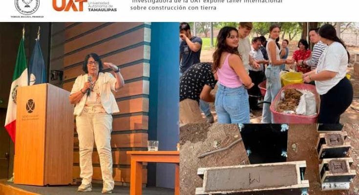 En el evento, la Dra. Aranda Jiménez, miembro del Sistema Nacional de Investigadoras e Investigadores Nivel 2, decana y secretaria técnica de la Facultad de Arquitectura, Diseño y Urbanismo de la UAT, impartió el curso-taller titulado «La tierra vertida como sistema constructivo».
