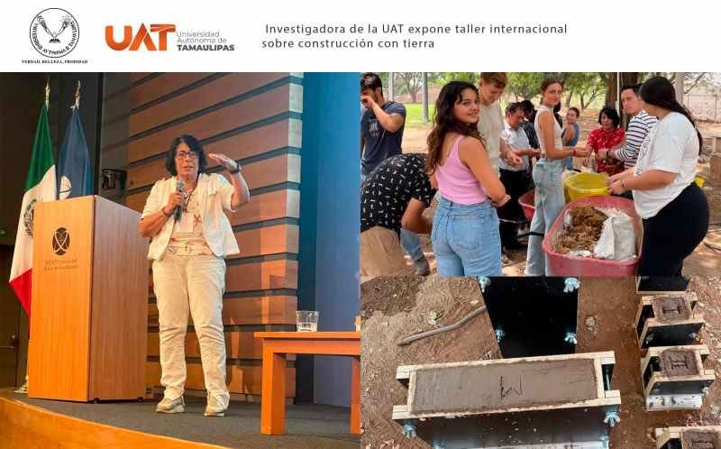 En el evento, la Dra. Aranda Jiménez, miembro del Sistema Nacional de Investigadoras e Investigadores Nivel 2, decana y secretaria técnica de la Facultad de Arquitectura, Diseño y Urbanismo de la UAT, impartió el curso-taller titulado «La tierra vertida como sistema constructivo».
