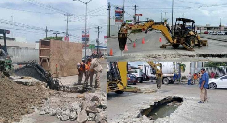 Personal de COMAPA Sur atendió de manera oportuna un hundimiento que se registró en transitada vialidad de Tampico, debido al colapso de una línea general de drenaje.