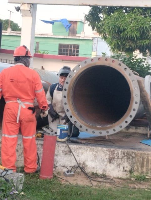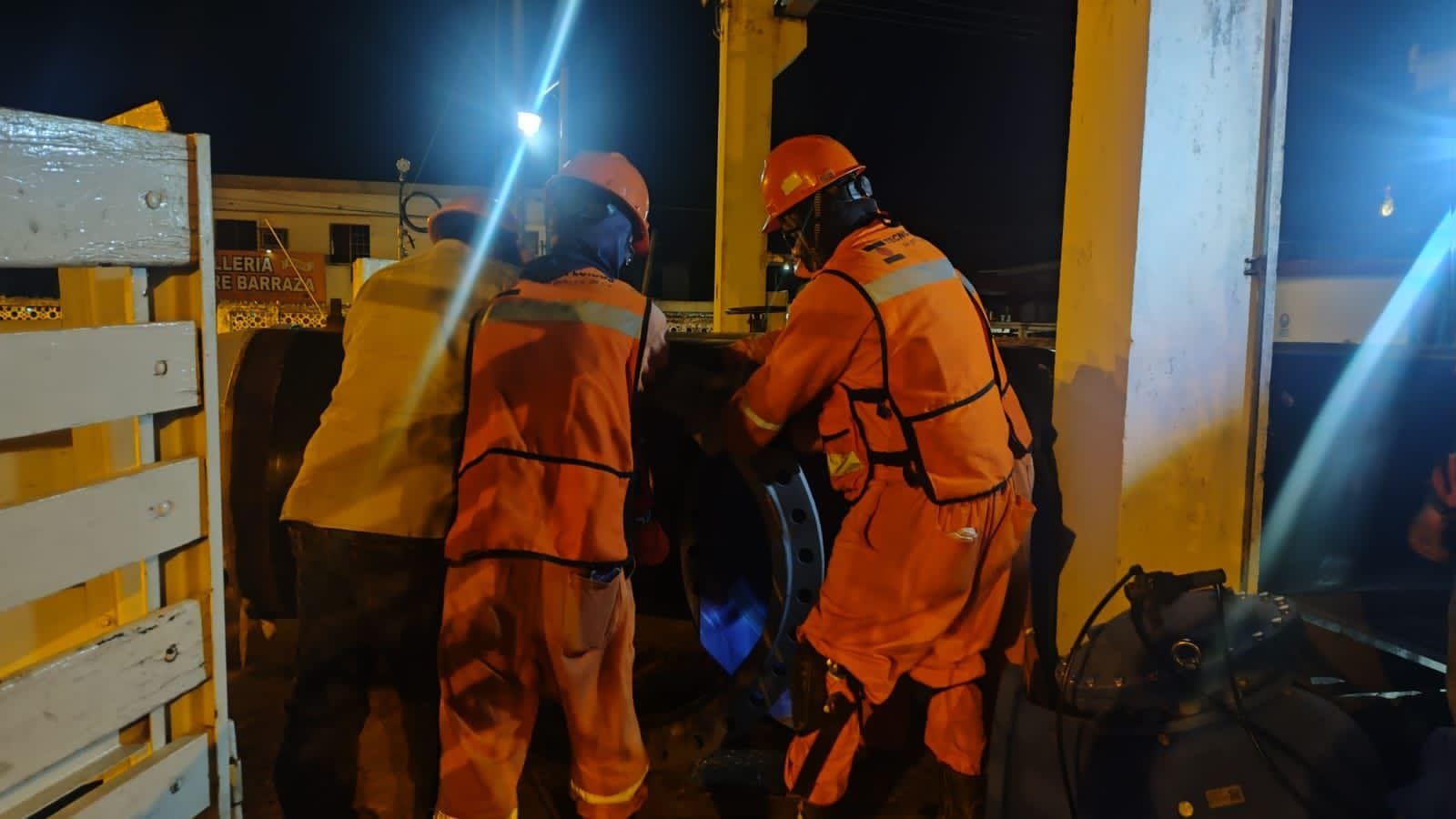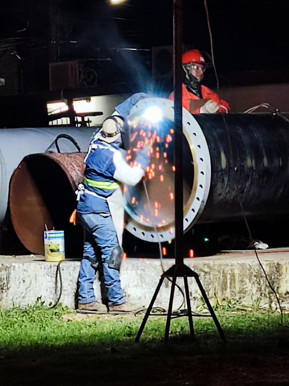 Durante el fin de semana, personal especializado del organismo trabajó de manera continua durante 24 horas, realizando el cambio del múltiple de descarga de los equipos de bombeo, componente con más de 30 años de funcionamiento y que presentaba un notable deterioro debido a la exposición prolongada a los gases de las aguas residuales.