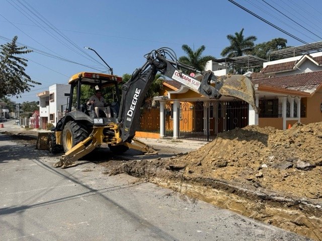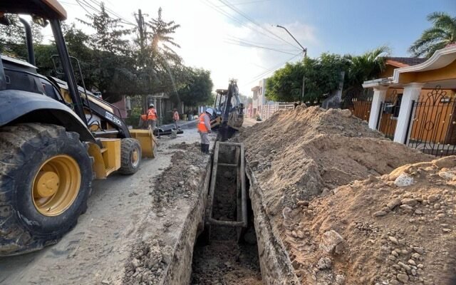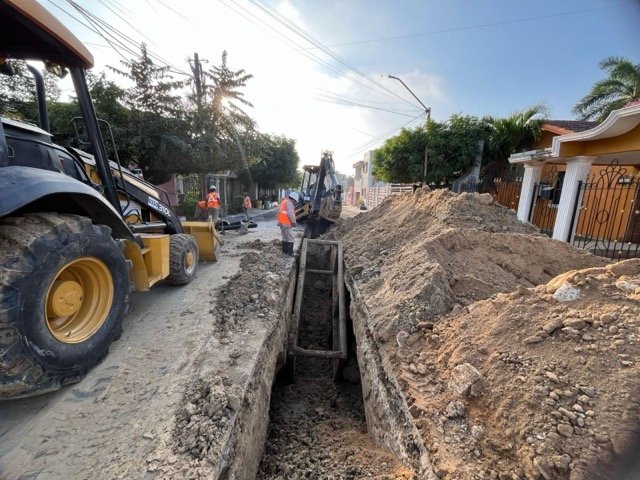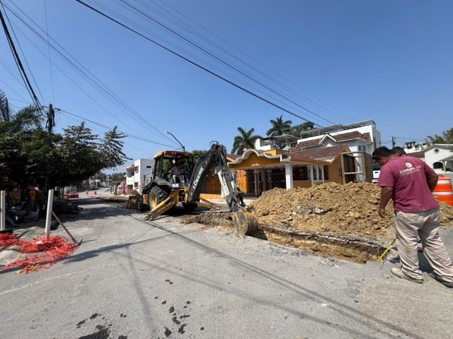 Los trabajos se desarrollan en la calle Licenciados, entre Médicos y Contadores, donde se sustituirán 100 metros lineales de tubería de 12 pulgadas, debido al avanzado deterioro del ducto existente, situación que provocó un hundimiento en la vialidad y requirió la intervención inmediata del organismo operador.