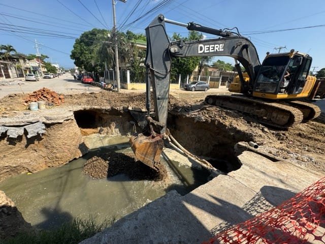Pronta respuesta de la COMAPA SUR al iniciar la reparar de una línea de 60 pulgadas de drenaje sanitario y de 4 pulgadas de agua potable en la calle 5 esquina con calle C en la colonia Enrique Cárdenas, con una longitud de 18 metros lineales.