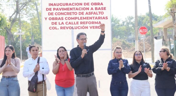Posteriormente llegó a la colonia Revolución Verde para entregar la calle Reforma, una nueva vialidad a base de concreto asfáltico, misma que conectará con la misma vialidad que está en proceso de pavimentación a base de concreto hidráulico con una inversión de cerca de los 6 millones de pesos. Con estas obras, se dignificará las vialidades para beneficios de niñas y niños de una escuela de preescolar, una primaria.