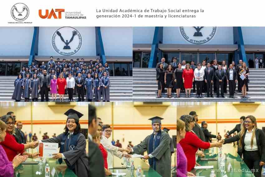 La Universidad Autónoma de Tamaulipas (UAT) llevó a cabo la ceremonia de graduación de sesenta y tres egresados de los programas de licenciatura y maestría de la Unidad Académica de Trabajo Social y Ciencias para el Desarrollo Humano, pertenecientes a la generación 2024 “MVZ Dámaso Leonardo Anaya Alvarado”.