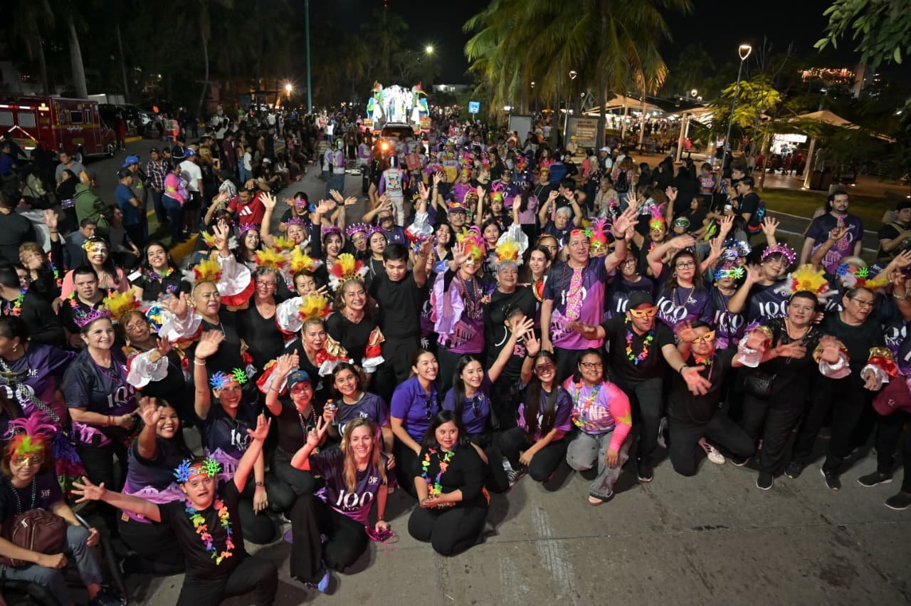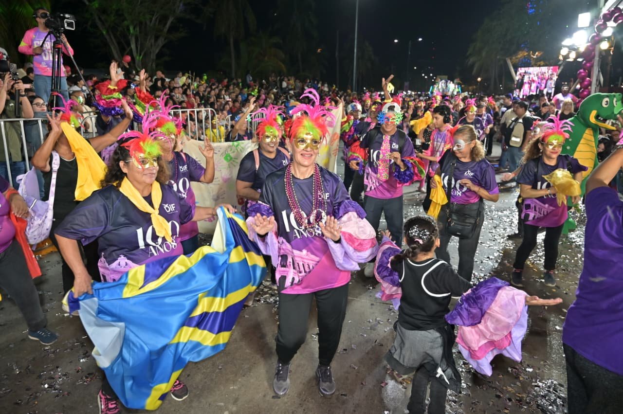La comparsa del DIF, integrada por más de 200 personas, luce con orgullo la playera emblemática de la celebración de los 100 años del edificio histórico del DIF Tampico, fortaleciendo el sentido de identidad y pertenencia en esta gran fiesta.