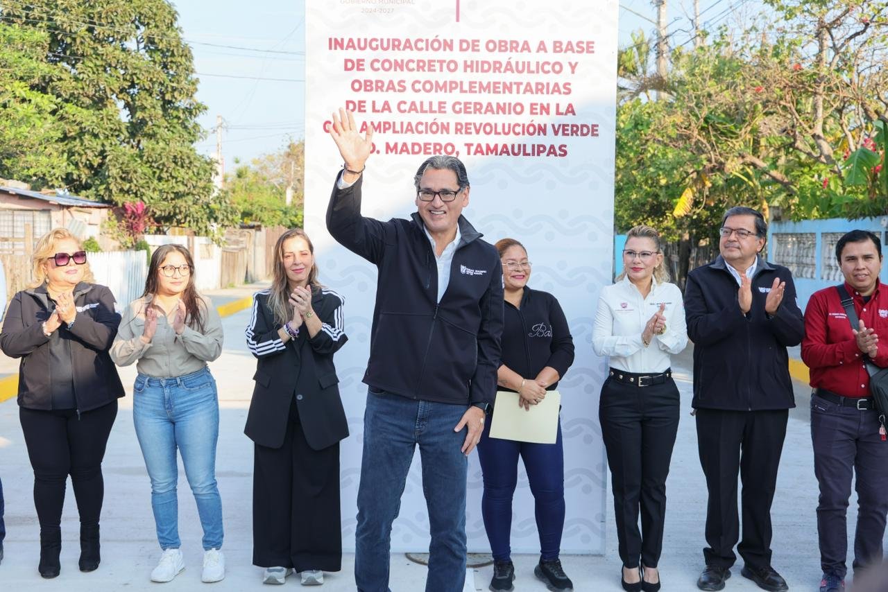 Desde temprana hora, el presidente municipal, Erasmo González Robledo, acompañado por la presidenta del DIF Madero, Lic. Dunia Marón Acuña, integrantes del Cabildo, directores generales y vecinos, estuvo en la colonia Ampliación Revolución Verde para hacer la entrega oficial de la calle Geranio, una obra de concreto hidráulico realizada con recursos federales a través del programa FAISMUN-DF por más de 3.3 millones de pesos, que además incluyó la rehabilitación de la línea de agua potable y drenaje sanitario, así como los servicios domiciliarios de tomas y descargas.