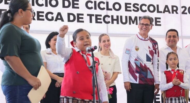 “Venimos a inaugurar esta monumental techumbre, porque está grande, y quedó para que niñas y niños puedan disfrutar de sus actividades deportivas y culturales, además para que puedan salir al receso y no les pegue tanto el sol, para que las mamás y los papás estén tranquilos”, expresó González Robledo.