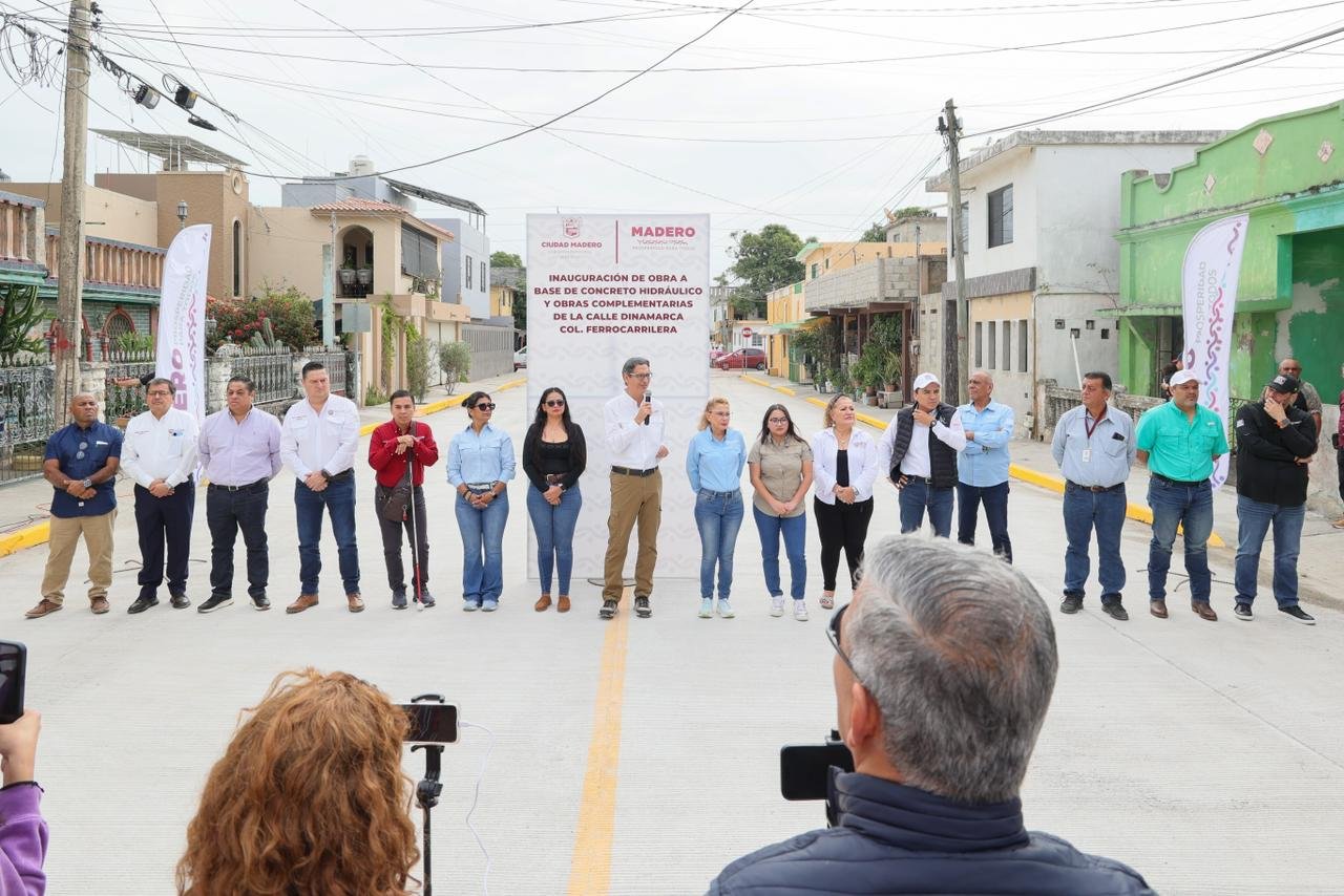 Con una inversión que supera los 2.3 millones de pesos, el presidente municipal Erasmo González Robledo, acompañado Síndicos y Regidores, vecinas y vecinos, inauguró la pavimentación de concreto hidráulico y las obras complementarias de la calle Dinamarca, ubicada en la colonia Ferrocarrilera. Estas obras representan una mejora sustancial para la conectividad y calidad de vida de más familias maderenses.