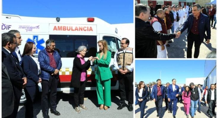 En este centro, que forma parte de la estrategia de recepción «México te Abraza» y que se ubica en la explanada del Polyforum Rodolfo Torre Cantú, el gobernador y la doctora María de Villarreal, presidenta del DIF Tamaulipas, acompañados por Ángel Elías Aguilar, coordinador de Estrategia de Retorno Humano, entregaron una ambulancia debidamente equipada para brindar servicio y traslados a las y los repatriados.