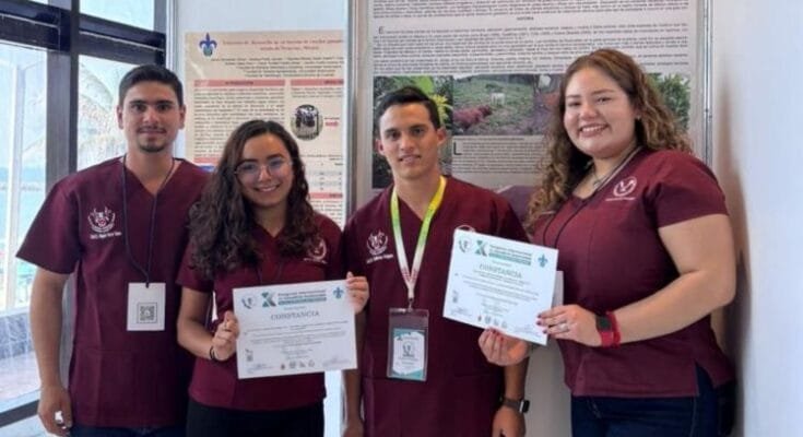 Miguel Nava, Karyme Ariciaga, Rossmy Cruz y Guillermo Delgado Hernández, adscritos a la Facultad de Medicina Veterinaria y Zootecnia, representaron con orgullo a la UAT mediante la exposición científica de sus proyectos de investigación, asesorados por su profesor, el MVZ Ned Iván de la Cruz.