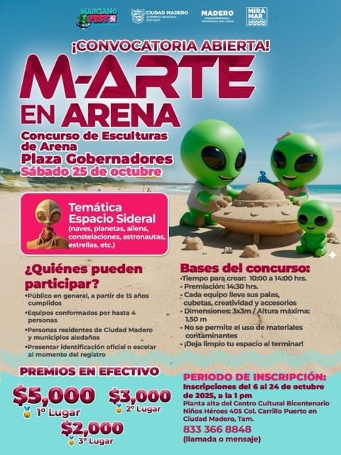 En el marco del esperado Marciano Fest 2025, el Gobierno Municipal de Ciudad Madero, a través de la Dirección General de Turismo, invita a la ciudadanía a participar en el concurso “M-ARTE EN ARENA”, que se llevará a cabo el próximo 25 de octubre en la plaza gobernadores de Playa Miramar.