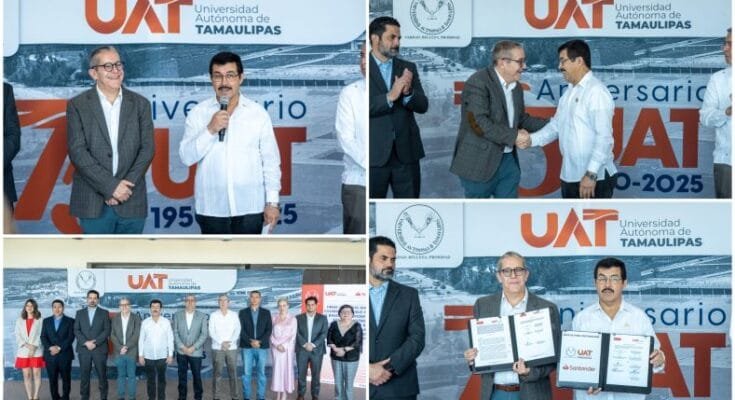 Con el propósito de consolidar alianzas estratégicas que impulsen el desarrollo académico, tecnológico y social de la comunidad universitaria, la Universidad Autónoma de Tamaulipas (UAT) suscribió el convenio marco de colaboración con Banco Santander México, en una ceremonia encabezada por el rector Dámaso Anaya Alvarado, y el director ejecutivo de Santander Universidades, Arturo Cherbowski Lask.