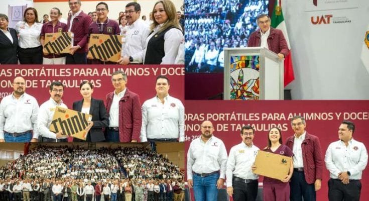 En un acto histórico, el gobernador Américo Villarreal Anaya y el rector Dámaso Anaya Alvarado realizaron la entrega simbólica de más de cinco mil equipos de cómputo portátil para estudiantes y docentes de la Universidad Autónoma de Tamaulipas (UAT).