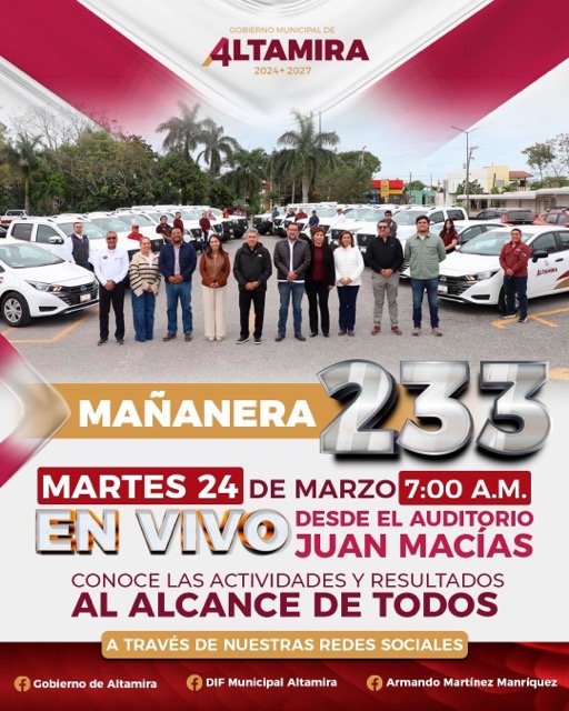 El Gobierno Municipal de Altamira anunció la transmisión en vivo de la Mañanera número 233, la cual se llevará a cabo este martes 24 de marzo a las 7:00 de la mañana, desde el Auditorio Juan Macías.