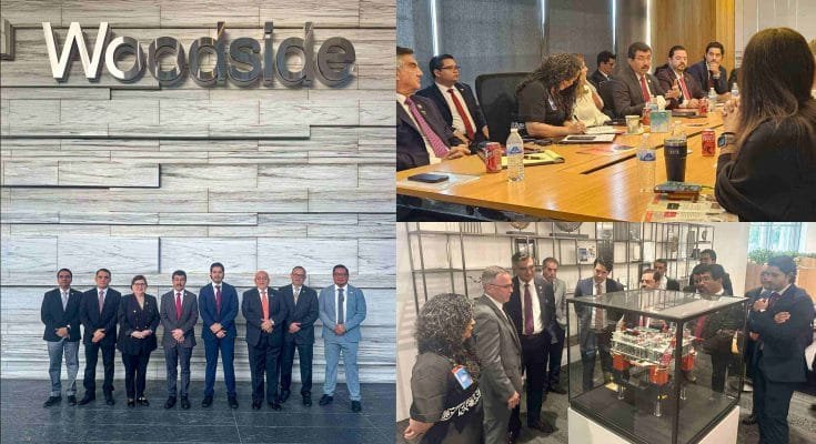 Los directivos de Woodside Energy Daniel Kalms, vicepresidente ejecutivo y jefe de la Oficina de Operaciones Internacionales, y Stephen Drouaud, vicepresidente del proyecto TRION, dieron la bienvenida a la comitiva tamaulipeca encabezada por el doctor Américo Villarreal.