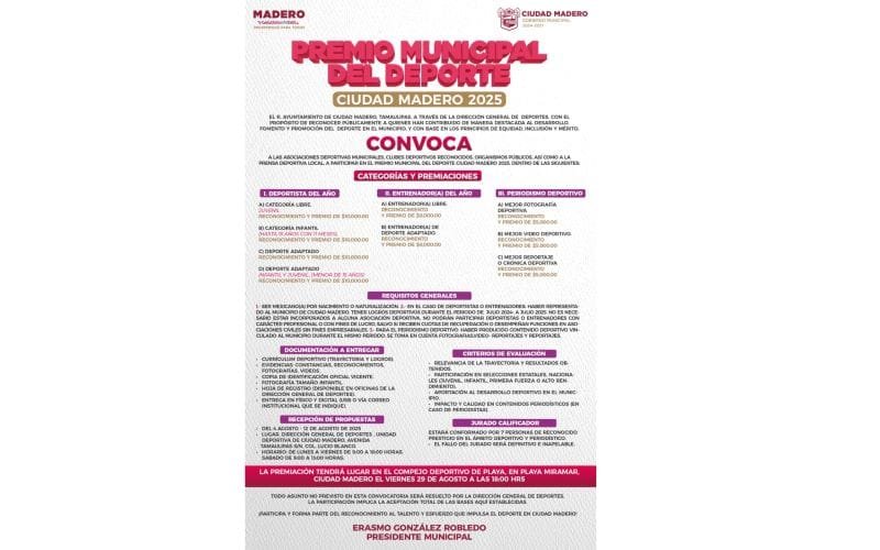 El presidente municipal Erasmo González Robledo, dio a conocer que las bases de esta convocatoria son basadas en los principios de equidad, inclusión y mérito, a los deportistas que han puesto muy en alto al deporte en diversas disciplinas en competencias municipales, regionales, estatales, nacionales y nivel internacional.