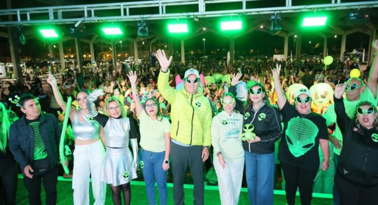 La plaza Gobernadores se transformó en un escenario de celebración, repleto de alegría, baile y diversión, comenzando con una impresionante caravana galáctica que presentó numerosos automóviles adornados como naves espaciales. A continuación, el público disfrutó de diversas exhibiciones de baile y del esperado Marciano Challenge, una dinámica colectiva que fusionó coreografías con actividades interactivas, permitiendo que los participantes se sintieran como seres de otra galaxia. Este evento culminó con el establecimiento de un récord oficial de 947 caracterizaciones, destacándose como el momento más significativo de la celebración.