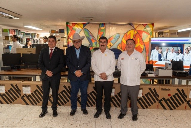 De manera complementaria, el rector hizo entrega de equipo tecnológico que incluye 13 cámaras tipo Policom para videoconferencia, 15 equipos de cómputo de escritorio, así como pantallas que permitirán modernizar los procesos de enseñanza mediante entornos digitales interactivos