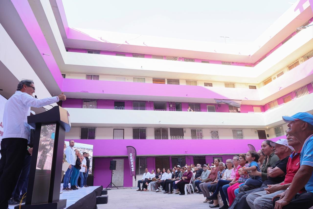 Durante su mensaje, el presidente municipal destacó la rapidez y efectividad del programa al señalar: “A prácticamente un mes de haber arrancado, miren cómo se transformó su vivienda… hoy este edificio se entrega para su uso y disfrute, pero sobre todo para fortalecer la identidad de quienes viven aquí”; Expreso.