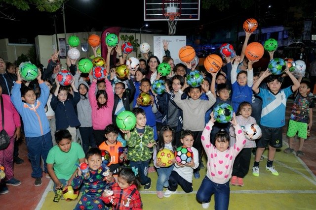 Tras el corte de listón, se realizaron dinámicas con las niñas y los niños presentes, a quienes se les entregaron balones de fútbol y básquetbol para que disfruten de este espacio público rehabilitado.