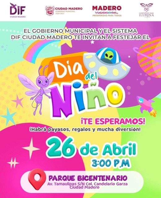Con el objetivo de celebrar a la niñez maderense en un ambiente lleno de alegría y convivencia familiar, el Gobierno Municipal de Ciudad Madero, que encabeza el C.P. Erasmo González Robledo, en coordinación con el Sistema DIF Municipal, titulado por la Lic. Dunia Marón Acuña, invita a todas las familias de la localidad a festejar el Día del Niño este próximo 26 de abril a las 3:00 de la tarde en el Parque Bicentenario.