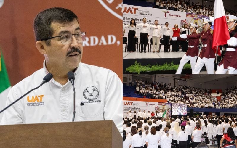 Con la presencia del secretario de Educación de Tamaulipas, Miguel Ángel Valdez García, representante del gobernador Américo Villarreal Anaya, el rector de la UAT puso en marcha el período escolar universitario en donde expresó su mensaje de bienvenida a la comunidad estudiantil, teniendo como marco los honores a los símbolos patrios.