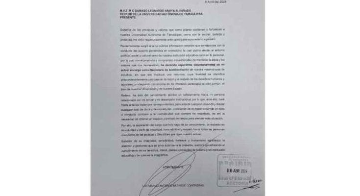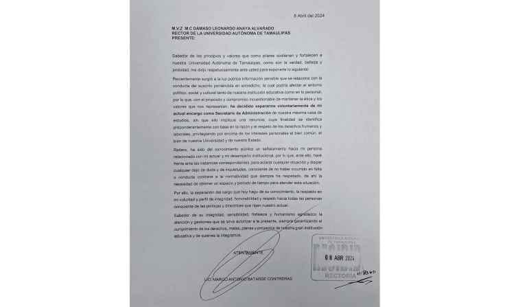 De acuerdo con el documento entregado al rector Dámaso Leonardo Anaya Alvarado, con fecha del 8 de abril de 2024, Batarse Contreras explica que ha tomado la decisión de separarse voluntariamente de sus funciones con la finalidad de atender señalamientos que lo involucran en presuntos hechos de índole personal y que son ajenos a la institución.