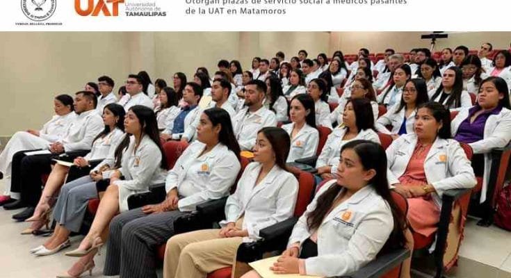 La Facultad de Medicina Matamoros de la Universidad Autónoma de Tamaulipas (UAT) celebró una ceremonia en la que se otorgaron plazas de servicio social a pasantes de la carrera de Médico Cirujano, quienes, tras concluir su internado de pregrado, se integran a este programa asumiendo el compromiso de servir a la sociedad a la que pertenecen.