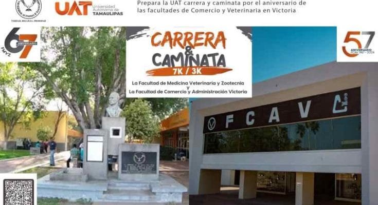 La Universidad Autónoma de Tamaulipas (UAT) prepara la Carrera Caminata 7K y 3K, que se llevará a cabo el próximo 19 de octubre, como parte de las actividades para celebrar el 67 aniversario de la Facultad de Medicina Veterinaria y Zootecnia y el 57 aniversario de la Facultad de Comercio y Administración Victoria.