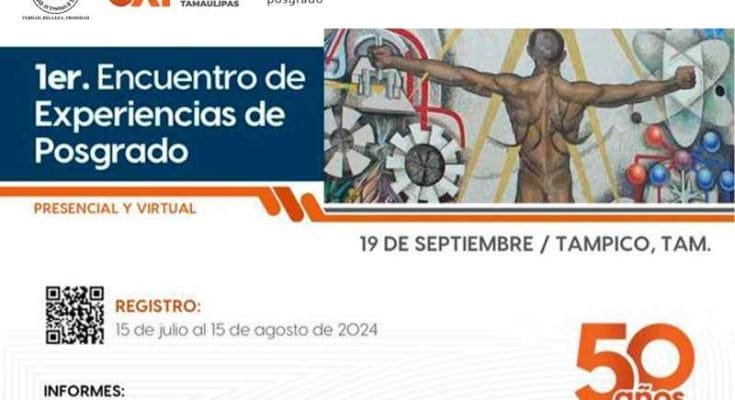 La Universidad Autónoma de Tamaulipas, por medio de la Secretaría de Investigación y Posgrado, llevará a cabo el Primer Encuentro de Experiencias de Posgrado el 19 de septiembre en el campus universitario de Tampico, como parte de las celebraciones del 50 Aniversario del Posgrado en la UAT.