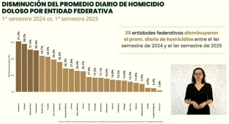 Ciudad Victoria, Tamaulipas. – Tamaulipas es una de las cuatro entidades del país en donde se registró la mayor reducción del promedio diario de homicidios dolosos, con una disminución del 50.4 por ciento, al comparar el primer semestre de 2025 con el mismo periodo de 2024 y, además, durante junio del presente año, sólo se registraron 15 casos de dicho delito, una cifra significativamente inferior al promedio nacional (61.50).