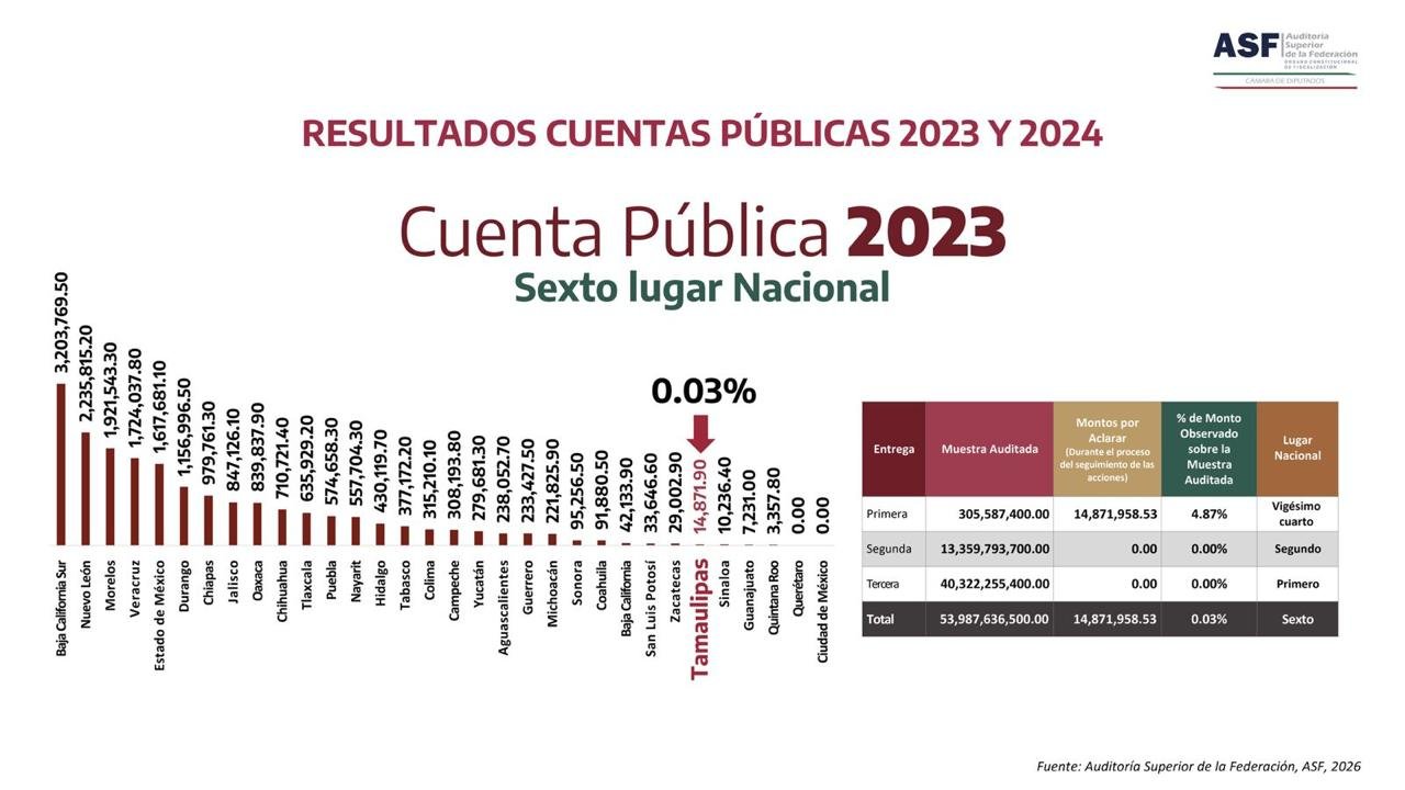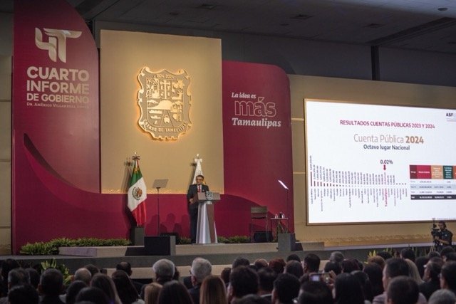 Ciudad Victoria, Tamaulipas.- En el marco del Cuarto Informe de Gobierno, el gobernador Américo Villarreal Anaya destacó la fiscalización de la Cuenta Pública 2024 realizada por la Auditoría Superior de la Federación (ASF), donde se reportó un monto por aclarar de apenas el 0.02% del total fiscalizado, ubicando a Tamaulipas como uno de los estados que mejor desempeño tienen en la materia.